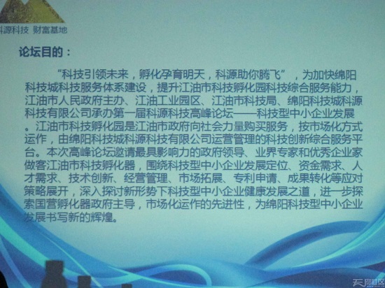 座落在江油市工業(yè)園區(qū)的江油巿科技孵化園大樓于今年9月15日投入使用,共有5200平方米,90個房間。目前已有33家科技型中小企業(yè)入駐,另有15家企業(yè)正準(zhǔn)備入駐,共搜集整理科技項目達(dá)668個。該孵化園由綿陽科技城科源科技有限公司運營管理,是省內(nèi)少有,綿陽區(qū)、市、縣首家政府向社會力量購買服務(wù),國營孵化器市場化運作的創(chuàng)新型科技綜合服務(wù)平臺。該孵化園在運營方式上,實行管理創(chuàng)新、服務(wù)創(chuàng)新、理念創(chuàng)新和一站式服務(wù)的最新模式。高峰論壇邀請了本市最具影響力的政府領(lǐng)導(dǎo)、業(yè)界專家和優(yōu)秀企業(yè)家做客論壇。