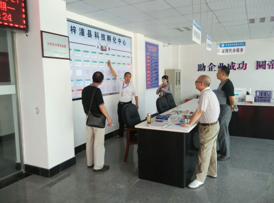2015年7月27日上午,綿陽市梓潼縣發(fā)改商務(wù)局和工業(yè)商務(wù)局李建忠副局長、何江林副局長等有關(guān)領(lǐng)導(dǎo)到梓潼縣科技孵化中心對(duì)大學(xué)生創(chuàng)業(yè)進(jìn)行調(diào)研。綿陽市梓潼縣科技孵化中心楊旭靜經(jīng)理全程接待陪同,并對(duì)孵化中心入孵的大學(xué)生創(chuàng)業(yè)企業(yè)進(jìn)行了詳細(xì)的介紹。