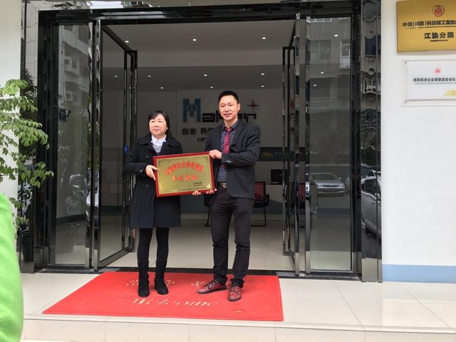 圖為韓銀華主席授“江油市女大學生回鄉(xiāng)創(chuàng)業(yè)實習基地”牌