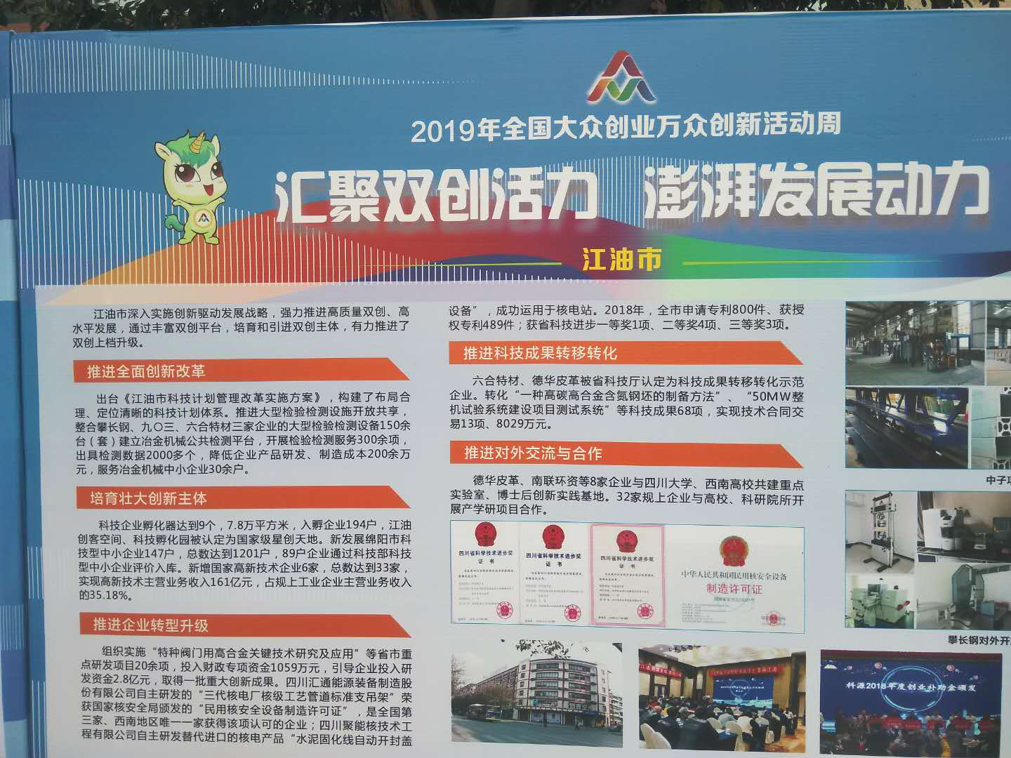 本次活動(dòng)還對綿陽雙創(chuàng)工作開展情況進(jìn)行了展覽展示,科源科技作為本土知名的孵化平臺(tái),在綿陽雙創(chuàng)工作推進(jìn)上畫下了濃墨重彩,雙創(chuàng)周成果展示上多個(gè)篇幅推出了科源旗下的江油創(chuàng)客空間、江油科技孵化園、梓潼縣科技孵化中心、鹽亭縣創(chuàng)業(yè)孵化中心的創(chuàng)新創(chuàng)業(yè)成果。
