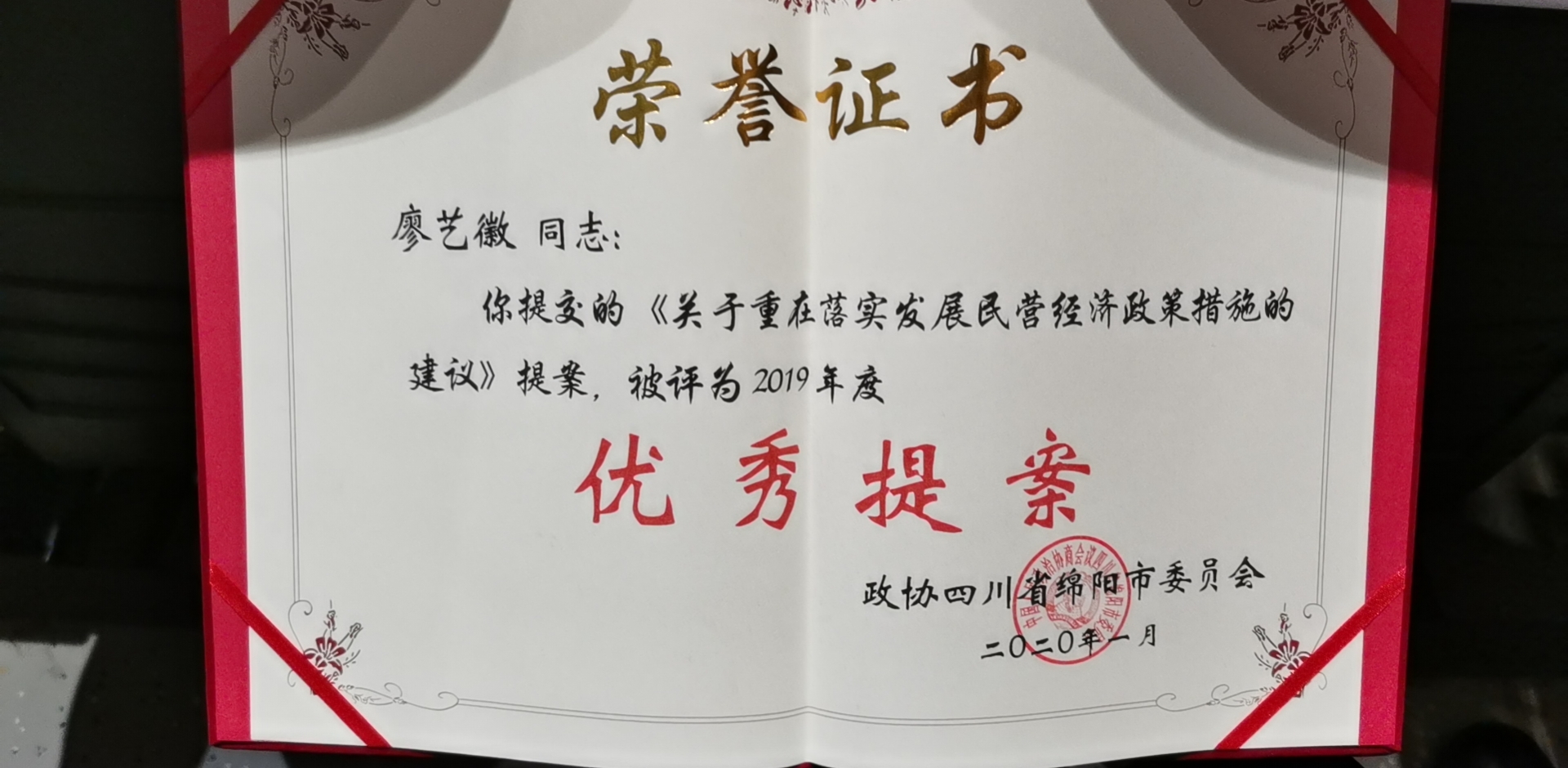 2020年1月13日,中國人民政治協(xié)商會議綿陽市第七屆委員會第五次代表大會在市委黨校知行堂召開。中共綿陽市委書記劉超,市委副書記、市長元方,市人大常委會主任馬華,政協(xié)主席張錦明,市委常委、統(tǒng)戰(zhàn)部長李亞蓮出席本次會議??圃醇瘓F董事長廖藝徽委員《關(guān)于重在落實發(fā)展民營經(jīng)濟政策措施的建議》的優(yōu)秀提案,獲得大會表彰。
